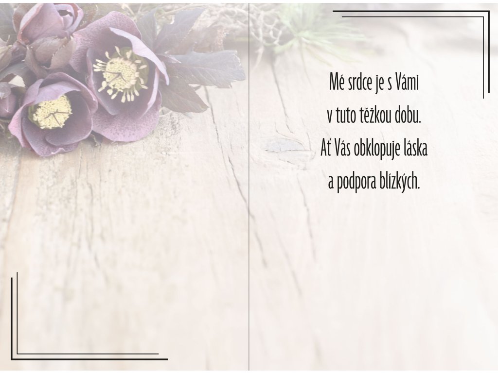 Text : Dokud žije v našem srdci, zůstává s námi. Mé srdce je s Vámi v tuto těžkou dobu. Ať Vás obklopuje láska a podpora blízkých.